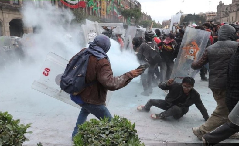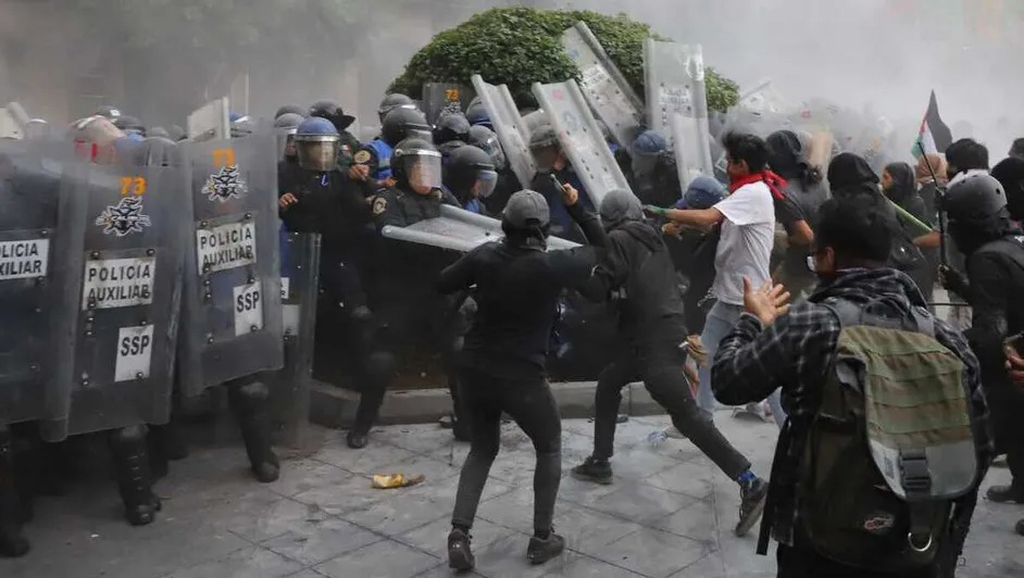 Más de 10 mil personas marchan por la capital. Al llegar al Zócalo, el polvo de las bombas molotov se mezcla con la indignación. Algunos jóvenes encapuchados agreden a la fuerza pública, saquean comercios, incendian patrullas. En Toluca, los disturbios se intensifican. La policía intenta impedir que periodistas graben. La confusión se apodera de la memoria.