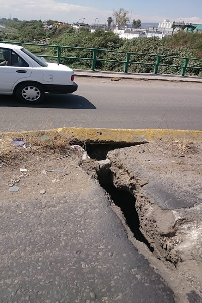 ECATEPEC DE MORELOS, Estado de México, 20 de marzo de 2017.- Escribo a Reportajes Metropolitanos para denunciar que en la Avenida Central, a la altura de la calle 20 de la Rústica Xalostoc, desde hace más de un año el puente que atraviesa el Gran Canal de la Aguas Negras tiene fisuras o fracturas que ponen en riesgo a los automovilistas y peatones, sin que las autoridades ordenen repararlo.