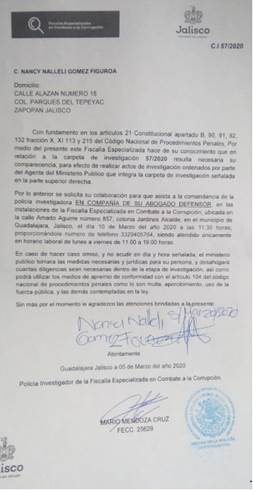 Es entonces que con la mutilación de la Carpeta de Investigación se pretende no incluir las constancias y registros que obran en la carpeta en la que se demuestra mi conducción bajo los principios de legalidad, honradez, eficiencia, profesionalismo, honradez y respeto a los Derechos Humanos reconocidos en la Constitución, principios de los cuales siempre me he manejado como servidora pública es entonces que con la mutilación de dichos registros se pretende atribuir de manera Dolosa una conducta antijurídica, de la cual con dicha mutilación se pretende fabricar e imputarme una conducta con apariencia del delito al no agregarse la totalidad de registros y constancias que obran en la Carpeta de Investigación, con fecha 05 de marzo del año 2020 a las 16:00 horas se presentaron en mi domicilio particular personas armadas quienes refirieron pertenecer a LA POLICIA INVESTIGADORA DE LA FISCALIA ESPECIALIZADA EN COMBATE A LA CORRUPCIÓN para hacerme entrega de un citatorio para que me presentara a realizar diligencias de investigación dentro de la carpeta que se encuentra instaurada en mi contra con número de registro 57/2020 debiendo ser acompañada por abogado defensor, por lo que intuyo que ante la negativa del desahogo de las pruebas ofertadas por la que suscribe y para efectos de aparentar la legalidad en su irregular integración de la carpeta de investigación pretenden formalizar mi presentación no obstante de que yo ya comparecí por escrito, para los efectos de judicializar y solicitar la orden de aprensión e incoarme un procedimiento penal en mi contra para someterme y así justificar el despido realizado impunemente violentando todos mis derechos fundamentales, procesales y humanos. Para efectos de dilucidar lo anterior inserto el documento antes señalado.