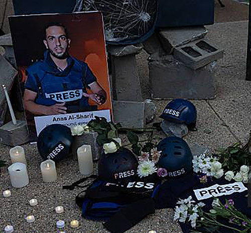 Los asistentes encendieron veladoras, colocaron flores y leyeron fragmentos del mensaje póstumo de Al-Sharif, quien había advertido que sería asesinado por su labor periodística: