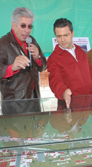TOLUCA DE LERDO, ESTADO DE MEXICO, 27 de julio de 2010.- El gobernador Enrique Peña Nieto supervisó las obras de modernización de la avenida Las Torres y del museo Torres Bicentenario, que beneficiarán a más de un millón y medio de personas de cinco municipios del Valle de Toluca, considerado la quinta zona metropolitana más grande del país. Tras un recorrido por los trabajos de construcción de los puentes deprimidos en los cruces con Paseo Colón, Jesús Carranza, José María Pino Suárez, 5 de Mayo y Díaz Mirón, así como Ignacio Comonfort y Avenida Tecnológico, que en general tienen un avance del 62.34 por ciento y una inversión total de mil 600 millones de pesos, el titular del Ejecutivo estatal indicó que esta obra consolida la infraestructura que en materia de comunicaciones se realiza en la Zona Metropolitana del Valle de Toluca. El Museo Torres Bicentenario, dijo, es una obra emblemática que significará el legado de esta generación en la celebración del Bicentenario de la Independencia y el Centenario de la Revolución; además de mejorar la imagen urbana de la capital mexiquense.