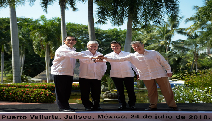 PUERTO VALLARTA, Jalisco, 24 de julio de 2018.- La Alianza del Pacífico, que forman México, Perú, Chile y Colombia, acordó este martes buscar una mayor integración con el Mercosur, en medio de las tensiones comerciales mundiales.