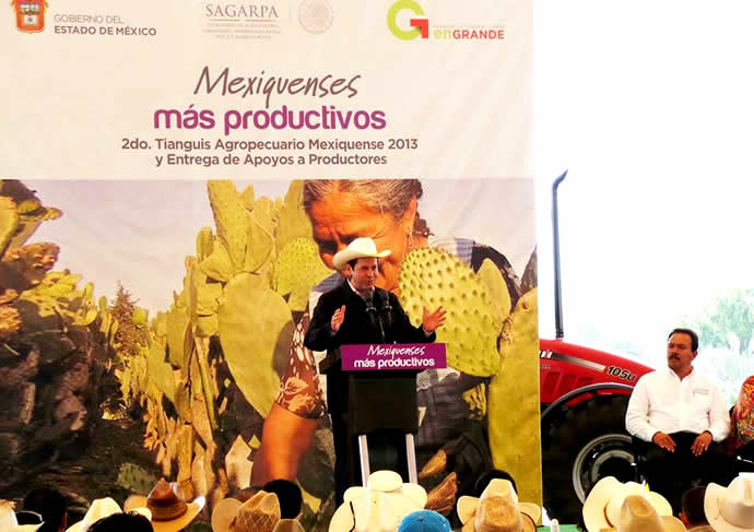 NOPALTEPEC, ESTADO DE MEXICO, 6 de junio de 2013.- Al inaugurar el Segundo Tianguis Agropecuario Mexiquense 2013, en la Hacienda Tepetzingo, el gobernador Eruviel Ávila Villegas entregó apoyos económicos por 45 millones de pesos, a 2 mil 489 productores de nopal, tuna y xoconostle de 41 municipios de la entidad, para amortiguar las pérdidas por las heladas registradas en marzo pasado, a fin de apoyarlos para que mantengan el liderazgo en la producción y exportación de tuna, de haba verde, de chícharo, de carne de ovino, de trucha, de carpa, de flores.