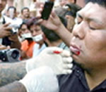 OAXACA, OAX.- Pobladores de Santa Lucía del Camino, que desde hace 27 días mantienen un plantón en el ayuntamiento, se cosieron la boca este mediodía para exigir la destitución del agente municipal en Santa María Ixcotel, Rafael Merlín Cortés. Cerca de las 12:30 horas, Omar Sumano Alonso y Sergio Zúñiga, tomaron aguja e hilo para coserse la boca para "callar" sus voces y "no lastimar los castos oídos del alcalde", Alejandro Díaz Hernández, a quien le exigen renuncia ante "la falta de sensibilidad política" para resolver esta problemática post-electoral.
