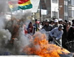 EL ALTO, BOLIVIA, 04 de mayo.- La violencia estalló en las poblaciones de El Alto y Santa Cruz, cuando esta última celebraba un referéndum de autonomía considerada ilegal por el Presidente Evo Morales, cuyo gobierno impidió la instalación de las casillas, por lo que los pobladores se enfrentaron con piedras y palos a los uniformados. Los enfrentamientos en la provincia de Santa Cruz han dejado un saldo de al menos un muerto y unos 20 heridos hasta el momento. Los manifestantes quemaron neumáticos frente al canal de televisión 24, propiedad del gobernador de La Paz, José Luis Paredes.