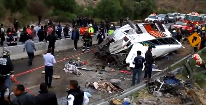 PACHUCA, HIDALGO, 26de mayo de 2013.- Al “volársele” la llanta trasera del lado izquierdo, un autobús turístico zigzagueo, pegó contra la barda de contención y se volcó sobre su propio eje, matando a 17 pasajeros y dejando heridos a otros 15, confirmó Alfredo Ahedo, secretario de Seguridad Pública de Hidalgo, al afirmar que el accidente ocurrió en la bajada de la carretera de Real del Monte, a la altura de la comunidad de San Guillermo y en la curva el autobús perdió el control.