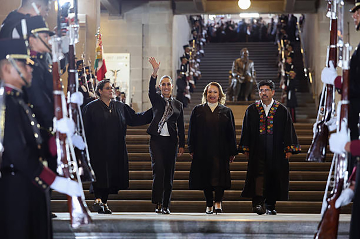 La jornada inició con un rito de consagración en Cuicuilco, donde representantes de nueve pueblos originarios entregaron bastones de mando a los nuevos ministros de la Suprema Corte de Justicia de la Nación.
