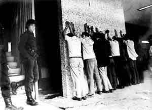 Mientras eso hago observo a través de la puerta del baño hacia la estancia del departamento. Está atestado de jóvenes detenidos. Hombres y mujeres. Todos están sentados en el piso y se les ha ordenado quitarse los zapatos. Aunque la luz esta apagada, gracias a la que se filtra del exterior puedo ver los rostros aterrorizados. También logro ver, con dificultad, parte de una habitación contigua a la estancia. Allí, dos sujetos golpean brutalmente a un muchacho, hasta hacerlo desplomarse. Sobre una cama hay alguien que se queja. También en la estancia hay varios heridos. Lo noto cuando el "mayor" pregunta si los hay. Entre gritos y empellones es introducida al departamento una muchacha, la cual es colocada en un rincón, junto a la puerta del baño y a unos metros de mí. Uno de los que la trajeron le increpa: "Traidora desgraciada —le dice— ¿qué es lo que quieren?, ¿para qué meten violencia si en México tenemos paz?. Aquí no le falta nada a nadie. Son unos traidores...". Luego ordena que sea cacheada: "¡Revísenle hasta las nalgas; no les dé pena!... Esta es una fichita". Y se la llevan a jalones. Poco después la traen, desaliñada y medio desnuda. Llora sin cesar. Vuelve a ser insultada e interrogada. Da su nombre, su dirección y otros datos.
