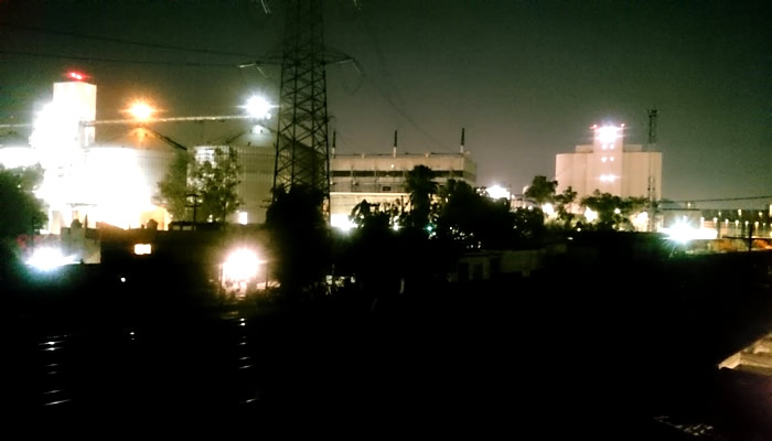 Vista panorámica del Parque Industrial Xalostoc. Vea la comparación desproporcionada entre los tanques de combustible de una sola fábrica, Químicos y Polímeros, contra el tamaño de varios tráileres y la flotilla de autos compactos de sus trabajadores.