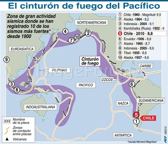 El continente ostenta el récord mundial del más intenso terremoto jamás registrado, de 9,5 grados en la escala de Richter, que se produjo el 22 de mayo de 1960 en la ciudad de Valdivia (840 km al sur de Santiago de Chile) y causó 3.000 muertos.